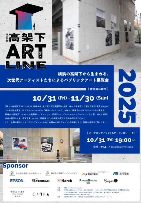 クリエイター向けコワーキングスペース「PILE」が運営する、創作活動サポートプログラム「PUSH FOR CREATION 2025」で選ばれた若手アーティストクリエイターによるパブリックアート展覧会「保土ケ谷高架下ART LINE 2025」が開催されます。相鉄本線「星川駅」から「天王町駅」まで走る線路の高架下壁面や横浜ビジネスパークの壁面などに出現するアート作品をお楽しみください。11月15日(土)にはアーティストによるガイドウォークも開催されます。