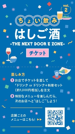 チケットを購入して、Eゾーンのお店をめぐり、各店の「ドリンク or ドリンク+料理セット(約1,000円相当)」を少しずつ楽しめる、お得な”はしご酒”イベント第2弾!