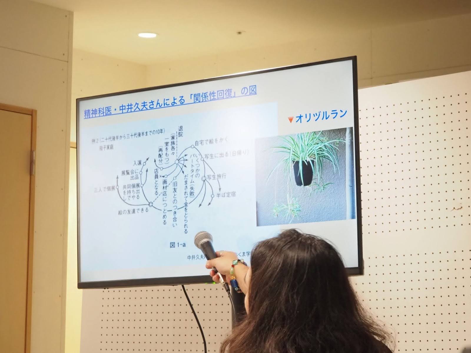 まず桜木さんがご紹介してくださったのは、精神科医・中井久夫さんの「関係性回復の図」についてのスライド。この図は、精神病を患った方が社会との関係を回復する過程を、植物の「オリヅルラン」に見立てて解説したものです。少しずつ外に出たり、家に戻ったり、友人に会ってみたりと、試行錯誤しながら社会とのつながりを取り戻していく過程が描かれています。