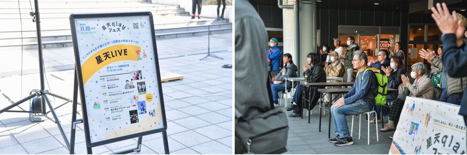 Bゾーン1階の駅前広場では、そのいつもの風景に音楽やパフォーマンスが重なり、フェスのはじまりを告げる「星天ライブ」が開催されました。