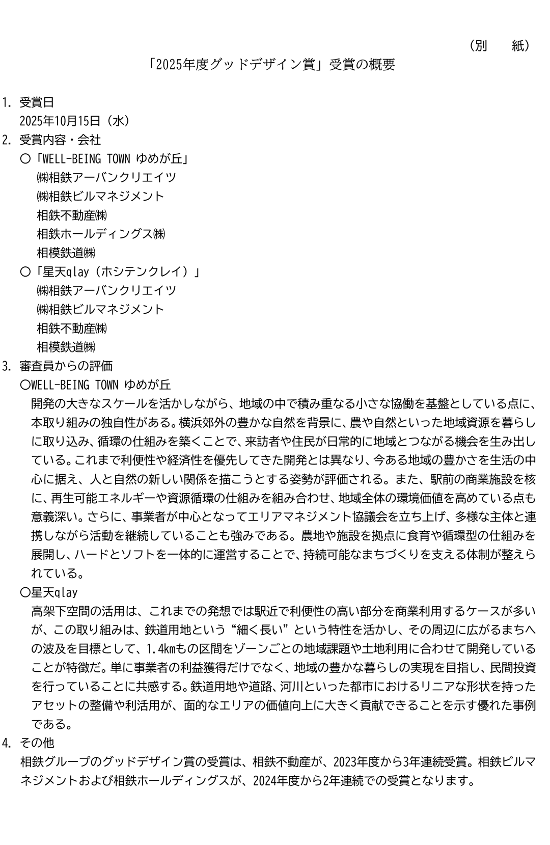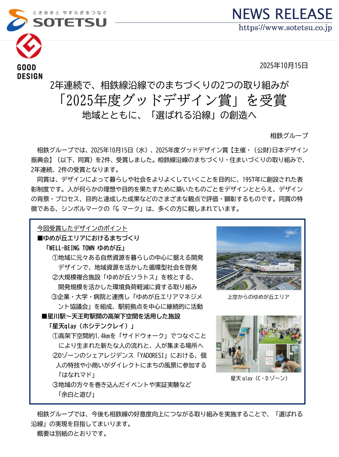 2年連続で、相鉄線沿線でのまちづくりの2つの取り組みが「2025年度グッドデザイン賞」を受賞