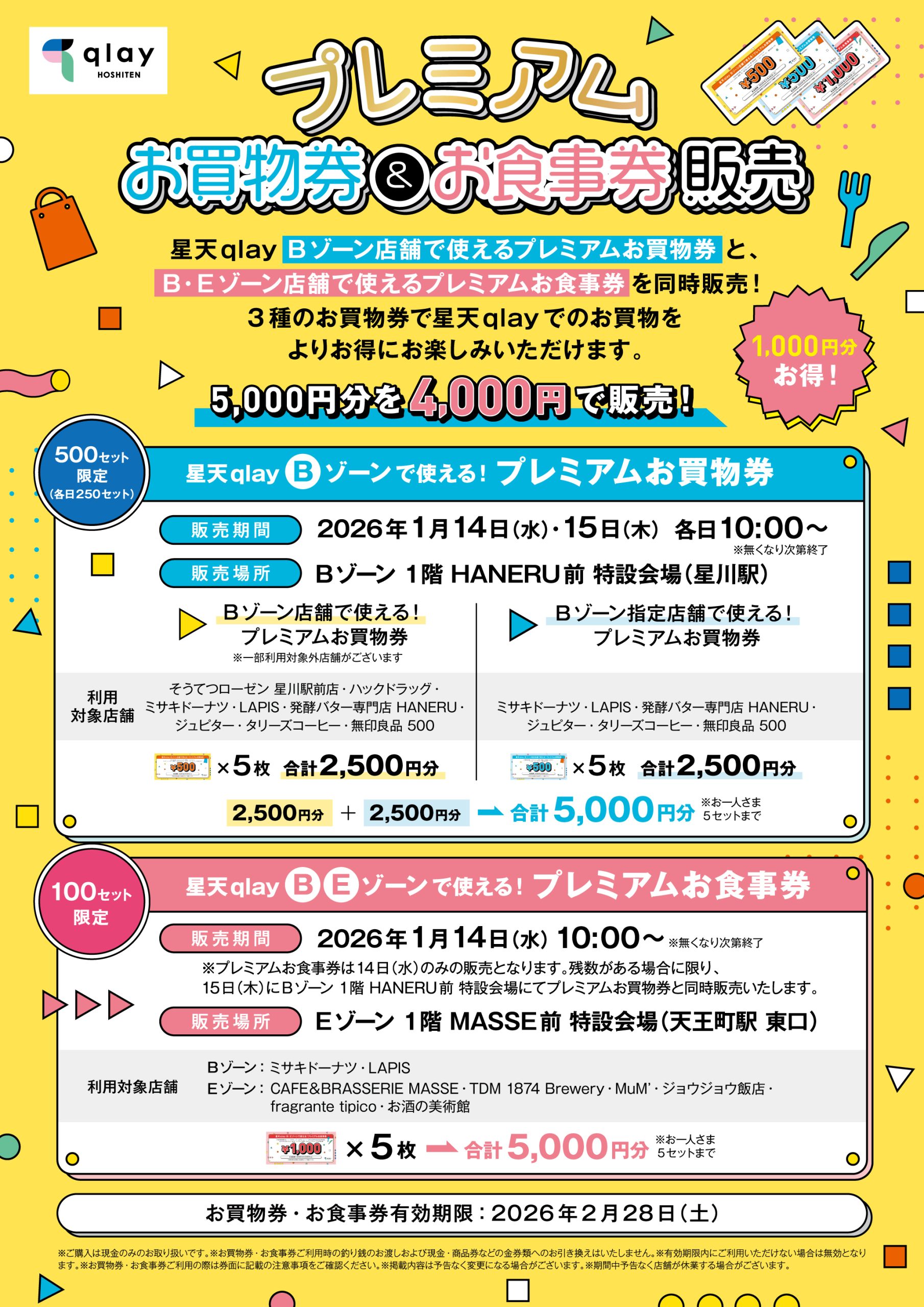 2026年1月14日(水)・15日(木)に星天qlayBゾーン店舗でご利用いただけるプレミアムお買物券が販売決定!